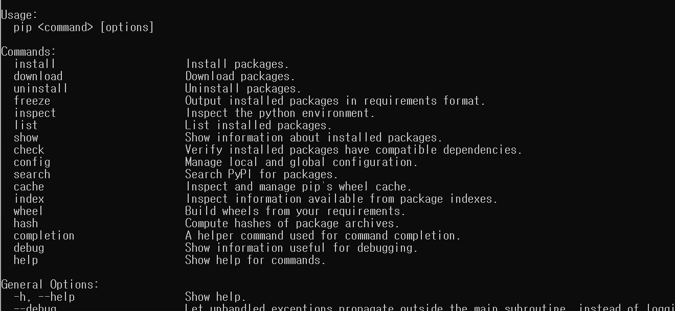 ์ ์ค์น ๋์์ผ๋ฉด cmd์ฐฝ์์ "pip" ์ ๋ ฅ ์ ์๋์ ๊ฐ์ ๊ฒฐ๊ณผ๊ฐ ์ฐํ๋ค.