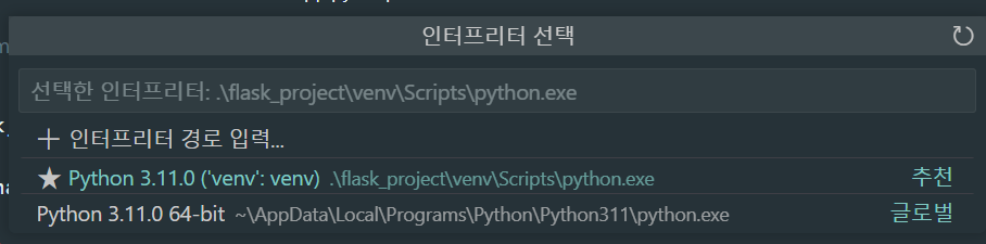 5. VScode์์ ์์ ํ๊ฒฝ ๋ด์ ๊ฐ์ํ๊ฒฝ์ ์ธํฐํ๋ฆฌํฐ๋ก ์ค์ ํ๊ธฐ